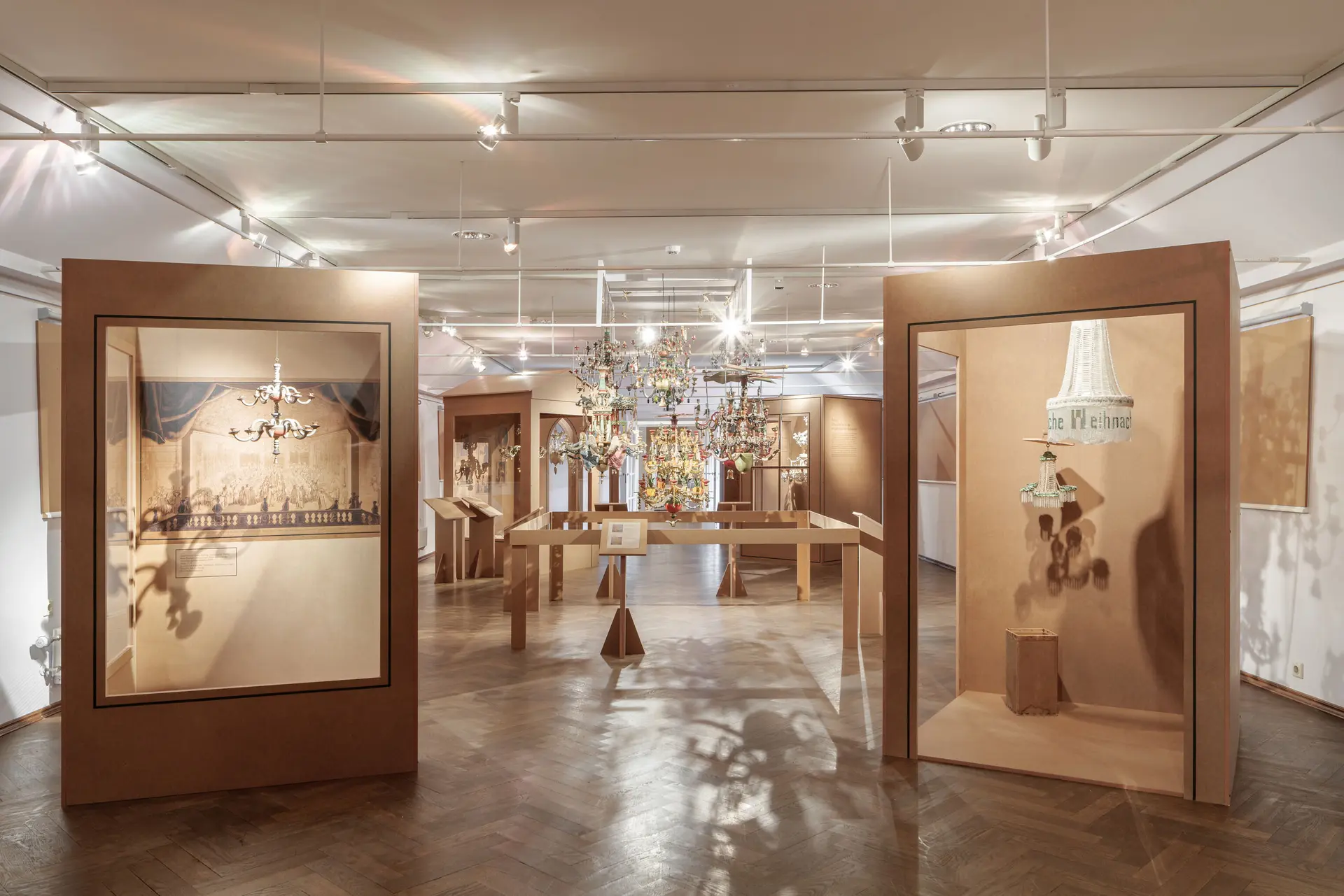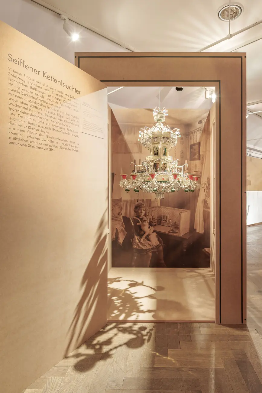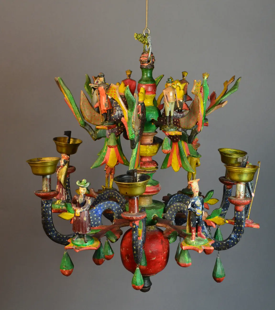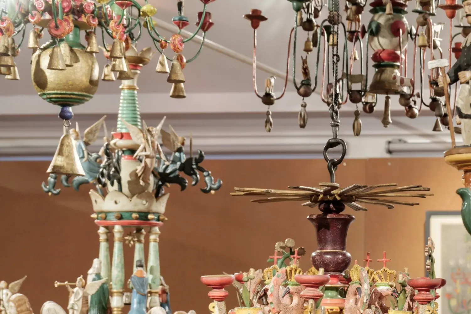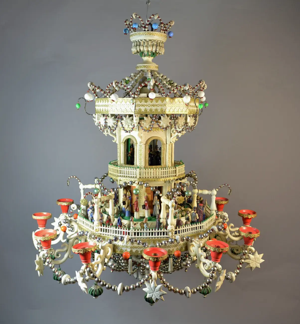 Opulente, mit Kerzen bestückte Kronleuchter, deren Lichter sich in den Glasbehängen brachen, waren eigentlich ein Privileg der Schlösser und Herrenhäuser. So etwas konnten sich die einfachen Erzgebirgler nicht leisten – doch sie hatten handwerkliches Geschick und kreatives Talent. So wurden die höfischen Vorbilder mit eigenen Mitteln in Holz nachgestaltet, gedrechselt, geschnitzt, bemalt und reich mit Engeln und biblischen Figuren behängt. Im Wettstreit untereinander schuf man die schönsten Familienleuchter speziell für den Heiligen Abend, denn nach der Weihnachtszeit mussten sie aus Mangel an Platz und teuren Kerzen wieder abgehängt werden.